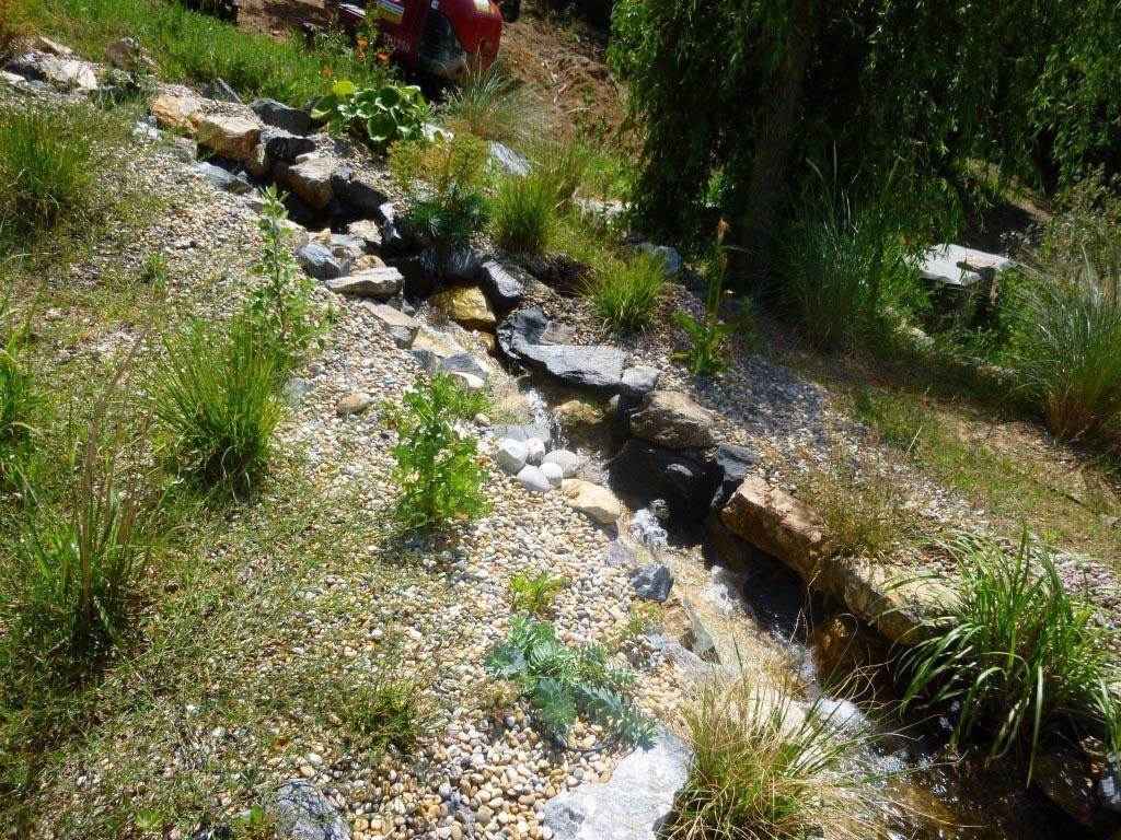 Problématique : Il fallait transformer cet ancien chemin d'eau en ruisseau paysagé se jetant dans un bassin aquatique, en conservant une eau claire et limpide.
