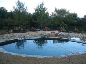 Ce potager a été entièrement crée : terrassement, apport de terre puis apport de compost végétal biologique en surface, murets en pierres pour retenir les terres, création de murets séparatifs en eucalyptus et chataigners servant également de tuteurs aux plantes potagères grimpantes, apport de paillis végétal (Système Jean Pain) pour la couverture du sol, installation de l'arrosage goutte à goutte automatique.